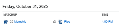 Memphis has had as confusing a last two weeks as any team in college football. First they lose to a UAB team that just fired their coach. Then they beat a ranked South Florida team that many people had penciled into the playoffs. We have no idea what to make of this team! Two weeks ago, Rice allowed 61 points to UTSA, but before that their defense was actually pretty good. Since we have no idea what to do with these games, we are going to take the points, but predict Memphis will win. Pick: Memphis 33 Rice 23